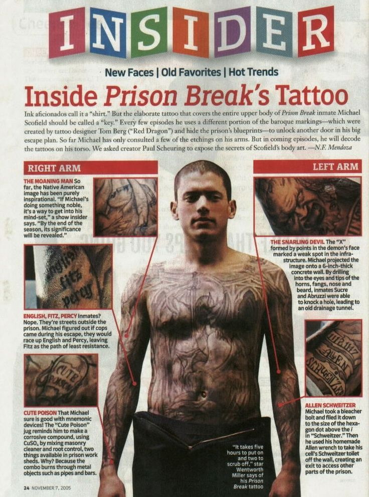 Episodio 1 ( Piloto): Michael se infiltra en la prisión y revela su plan a través del tatuaje que cubre su torso.